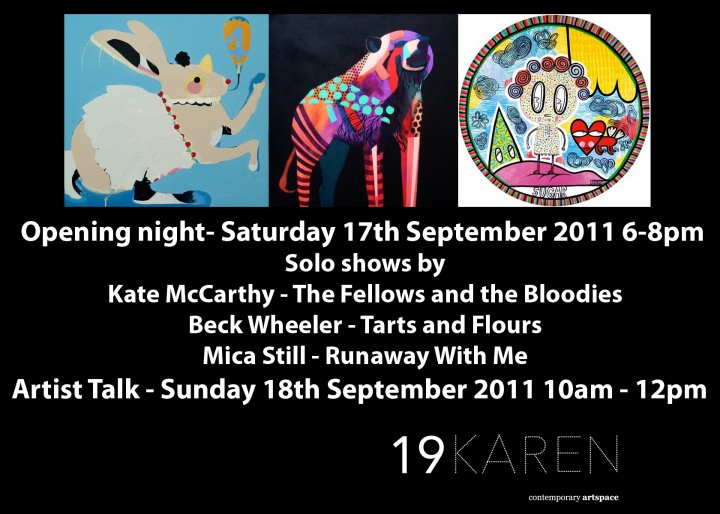 19 Karen Gallery on the Gold Coast has three openings this Saturday night with solo shows ‘Tarts and Flours’ from Beck Wheeler, ‘The Fellows and The Bloodies’ from Kate McCarthy and ‘Runaway with me’ with Mica Still.