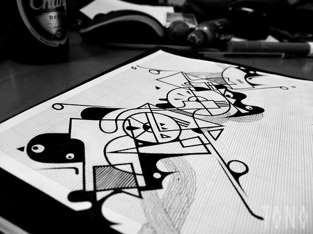 Taj Alexander, aka Deams of AWOL fame, has, through experience, influence and hard work, found an essential balance in a time honoured art theory – his mastery of clean geometry, lines and swaths of tone has given rise to a style that is, paradoxically, achingly familiar in feel and yet uniquely fresh in appearance. Intertwined abstractions merge seamlessly with asymmetrical patterning – which, coupled with his highly charged imagination and subject matter, results in gorgeous renderings from the artists hands.
