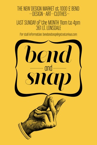 So it is not at all surprising when we hear they have set up a new monthly indoor design market of local illustration, fashion, design, jewellery and textiles. ‘Bend & Snap’, which held its inaugural market last month will be continuing to flourish every last Sunday of each month – yes that means this October, this weekend in fact.