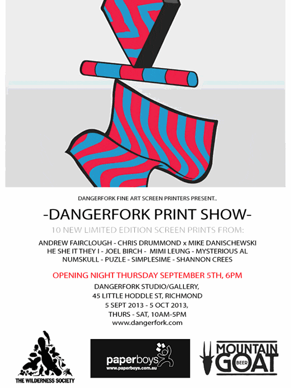 Dangerfork Print Show is a group exhibition featuring works from 10 contemporary Australian artists and designers. The show aims to showcase the medium of screen printing and to create a unique collaboration between artist and printer.