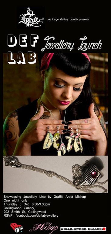 “DEF LAB is a new Melbourne Designer Jewellery Label, specializing in unique, quality, custom made designs. Made and designed in Melbourne by Graffiti Artist Mishap (At Large Gallery), the first collection also features some Limited Edition Silver rings from partner in crime Rolex Bifta.