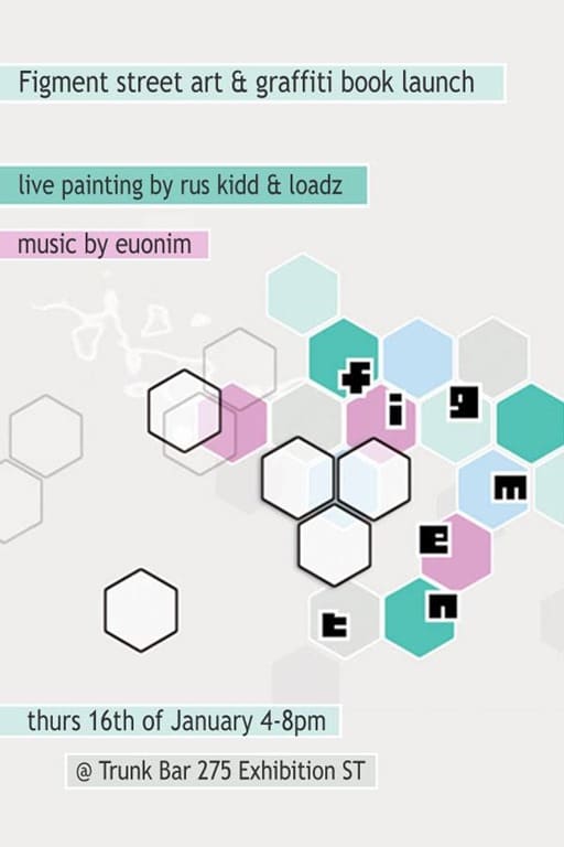 There will be live art by RusKidd & Loadz (and possibly one other…!) which can be purchased at the end of the night (if you are lucky enough to be first!) music by euonim and copies of Figment to be bought and signed.”