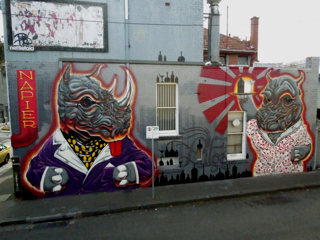 Most large walls I do I find challenging in their own ways. The wall I did with Silk, Dvate, Bail Libre and Nektar along the tracks between Richmond n South Yarra was fun, there was a 3+ meter drop at the wall – so we had scaff, and 7 meter ladders, and still only could reach 3~4 meters on the wall. It got a bit hairy trying to get to the top of the wall …