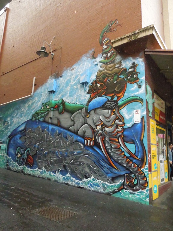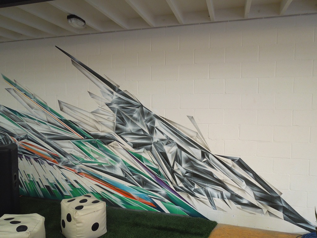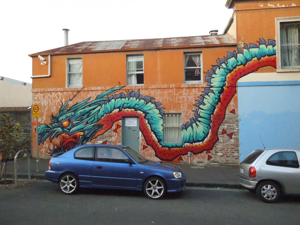 The dragon I painted in Brunswick St backpackers was also fun, it took me half a day to do the head and took me over a week to do that body… I decided to do this triangle pattern on the belly side of the dragon and that took way longer than expected on a ladder.