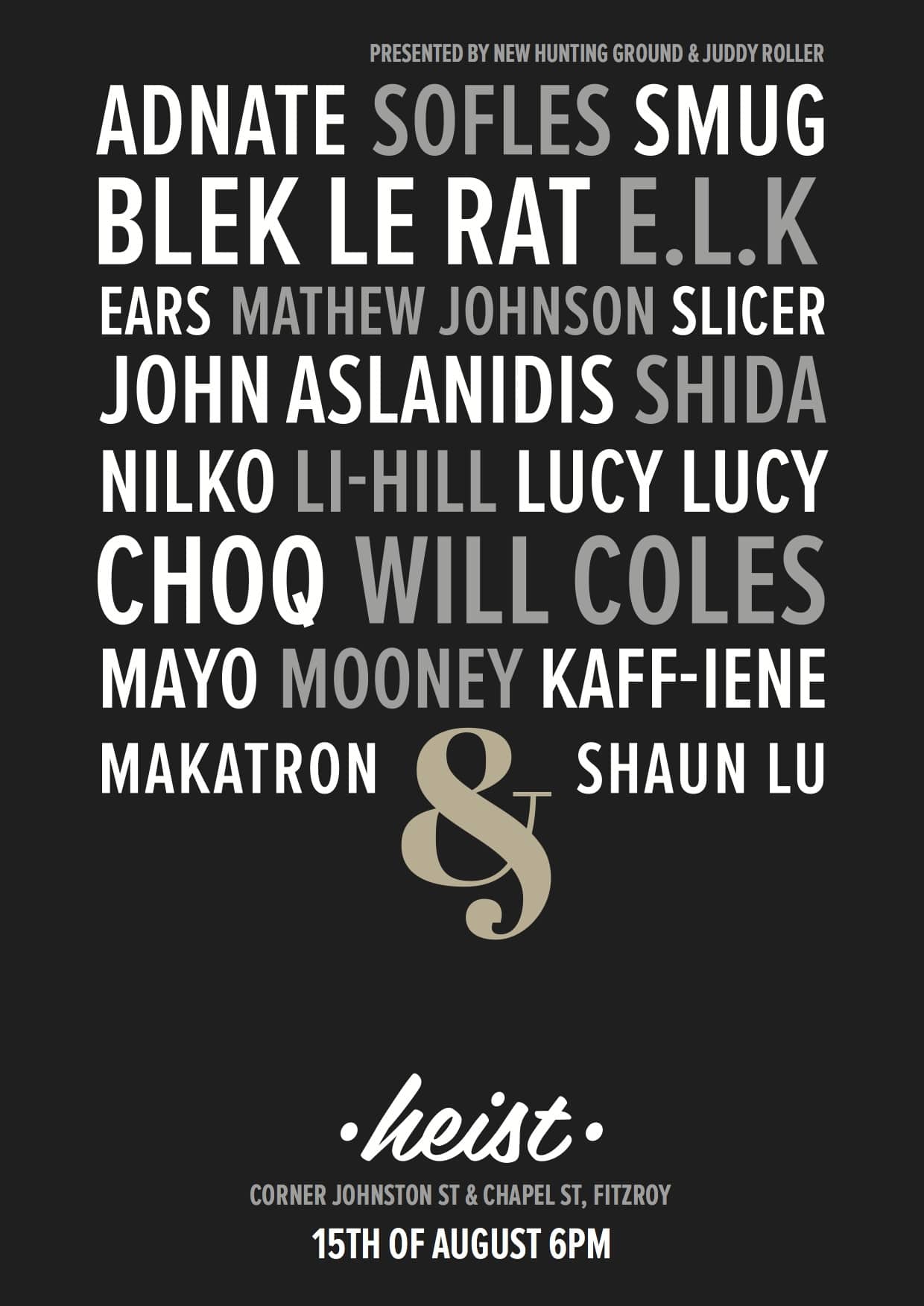 NEW HUNTING GROUND and JUDDY ROLLER Presents HEIST