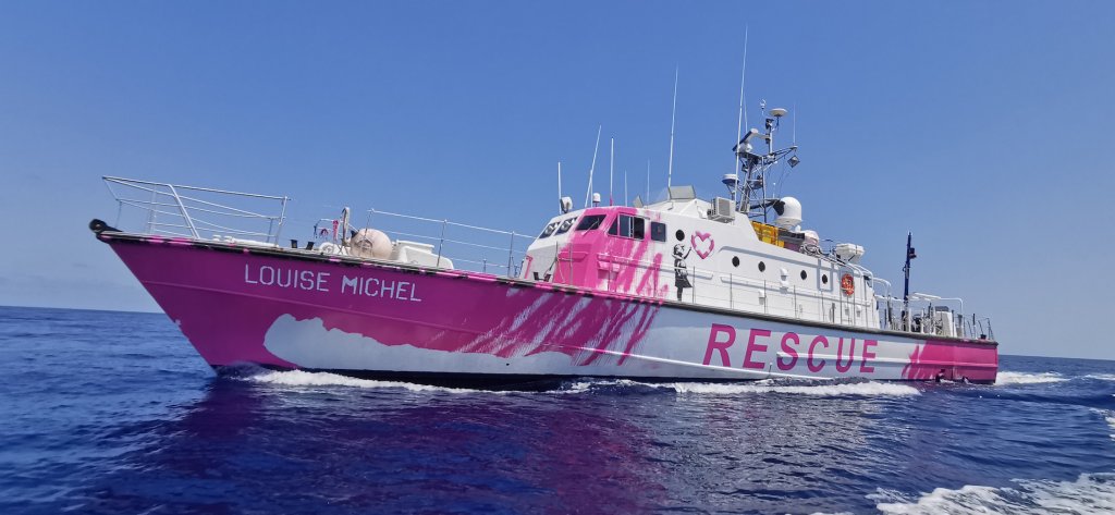 “The lifeboat Louise Michel, named after a French feminist anarchist, is a former French Navy boat customised to perform search and rescue and sails under a German flag. Measuring 30 meters in length and capable of over 28 knots, bought with proceeds from the sale of a Banksy migrant artwork.”