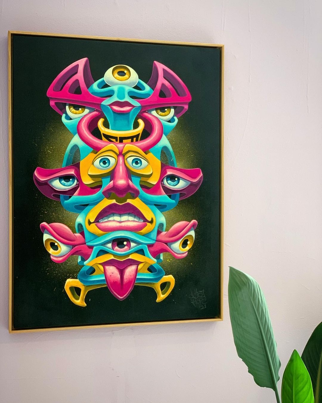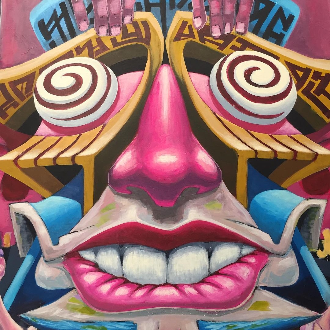 Each individual painting is a mix of tiny inspirations, novel ideas and experimental forms that draws upon my previous experiences and aims to push the boundaries of my skills and technical knowledge. Uniting each unique work is a strong focus on symmetry and balance, from the shapes and forms to the use of vibrant hues, deep shadows and varying colour palettes.” – Skübz Mope