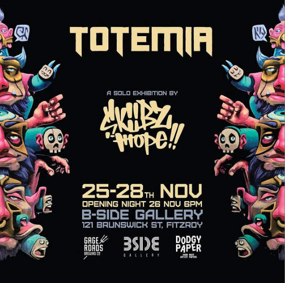 Get down to B-SIDE Gallery for the opening celebration of ‘TOTEMIA’ on Friday the 26th of November, proudly supported by Atomic, Gage Roads Brewing Co. and Matso’s Beer.